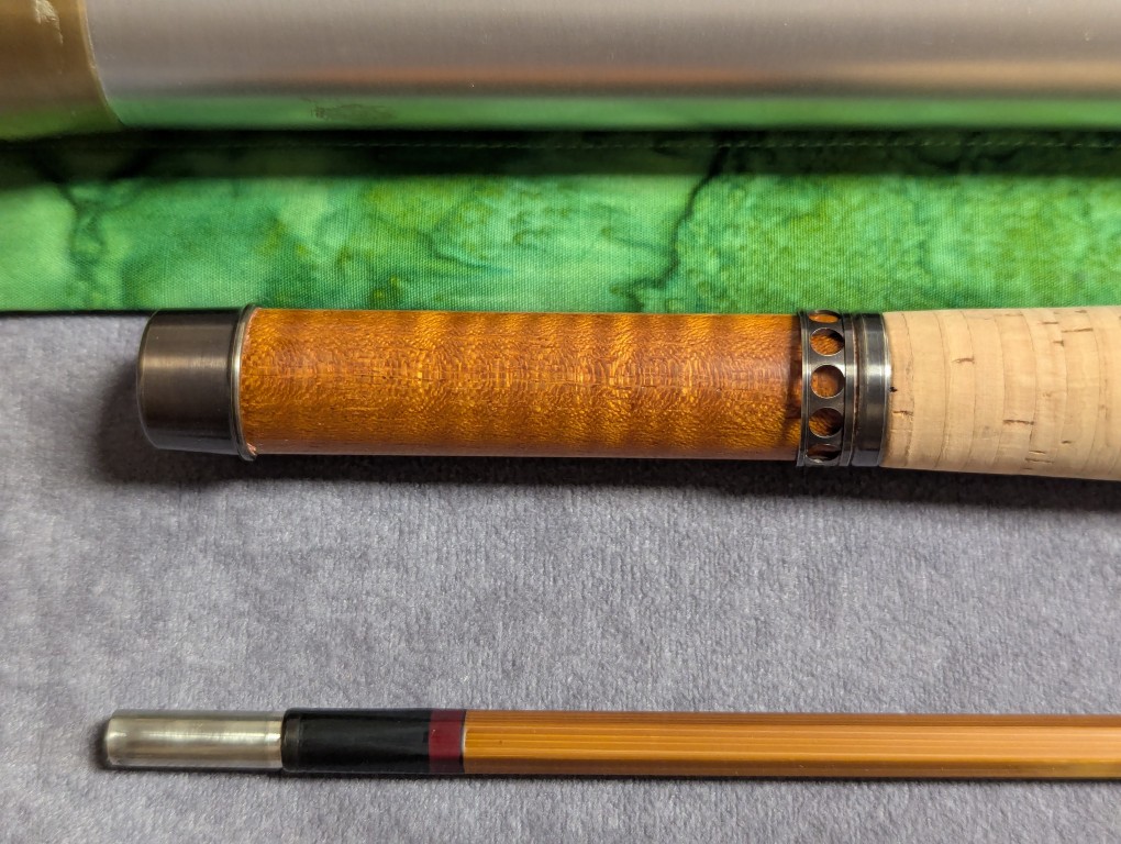 burgundy silk with black tipping. The reel seat is curly Spanish cedar. Typical of his current work