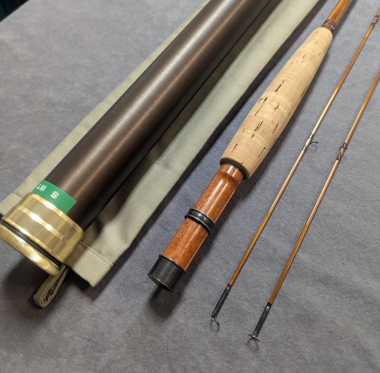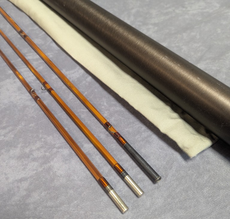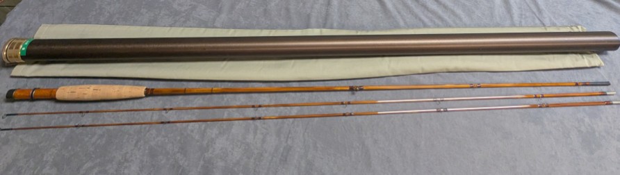 packed in khaki cloth rod bag and stored in brown aluminum brass capped rod tube. Rod is in