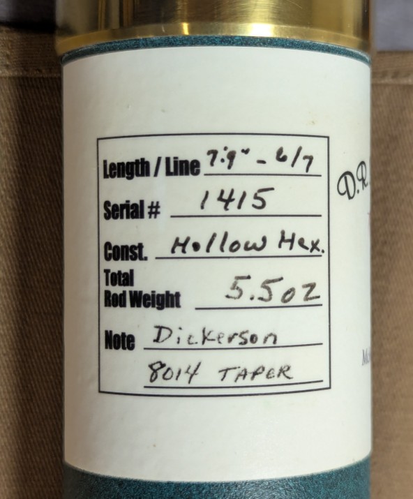 Rod comes packed in brown cloth rod bag and stored in green aluminum labeled brass capped rod tube.