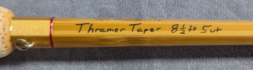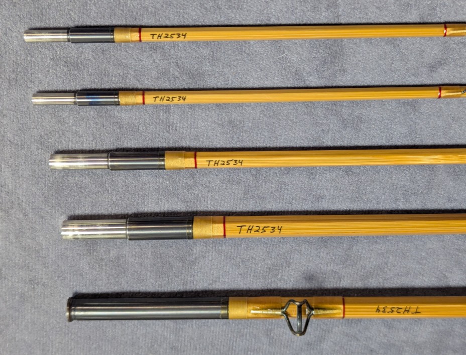 Wrapped in golden yellow tipped in red. Carbide stripper guide. Cigar cork grips on both, with blued