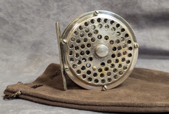 Half crank handle. Nickel plated brass. Raised protective rim model.Serial #14. Full length reel foot.