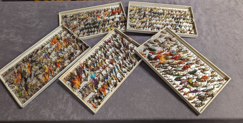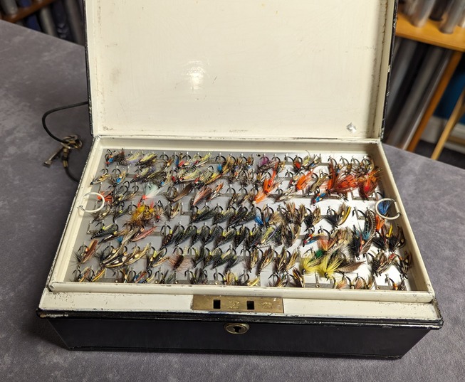 Has 5 lift out trays filled with hundreds of Salmon flies in excellent condition.
