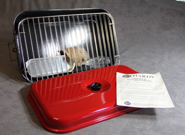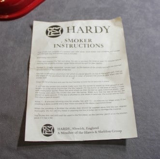 Contains bottom part with cover. wind shield, fuel container and smoke grill. Sample bag of smoke