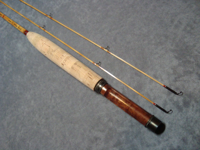 All rods are tapered to my own designs, generally characterized as "progressive" action. My rods are flamed to create a lightly mottled effect, and built with a swelled-butt. Reel-seat hardware includes decorative nickel silver butt-cap, sliding band, and cork-check. Buyers have a choice of various wrapping colors and may select from several species of highly figured wood for the reel seat. All rods are furnished with the following standard features: