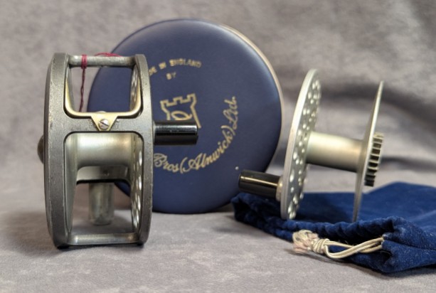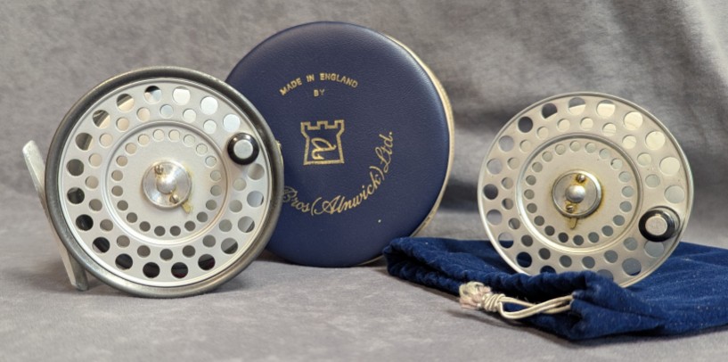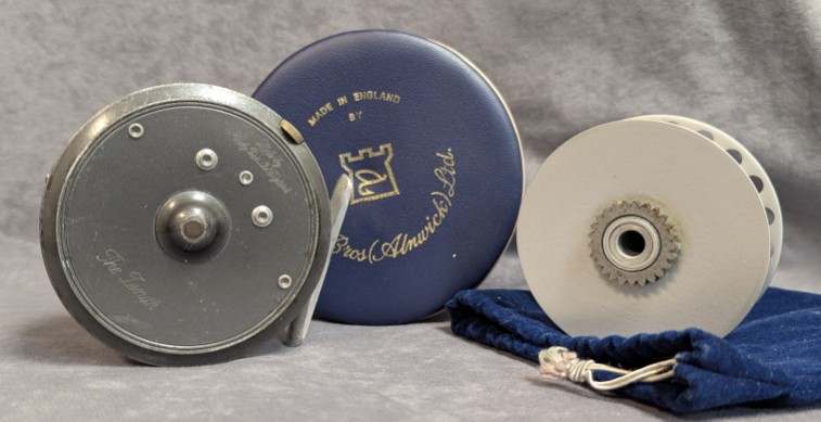 and white factory marked zippered reel case. Spool stored in blue drawstring reel bag. Reel and