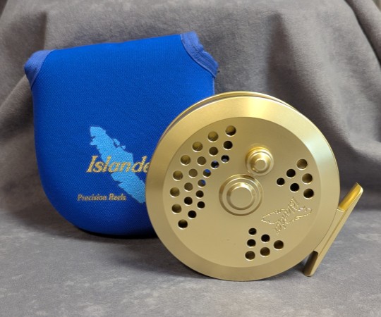 Rear on/off click button. Reel comes packed in original Islander neoprene reel pouch.