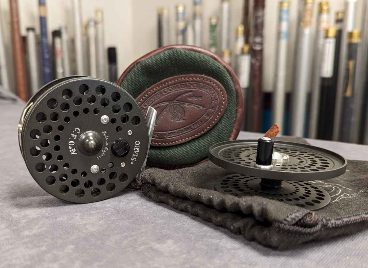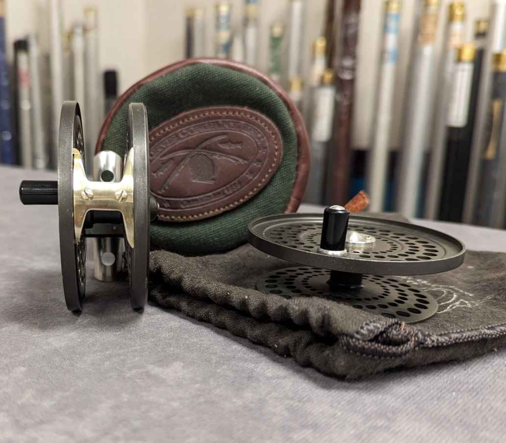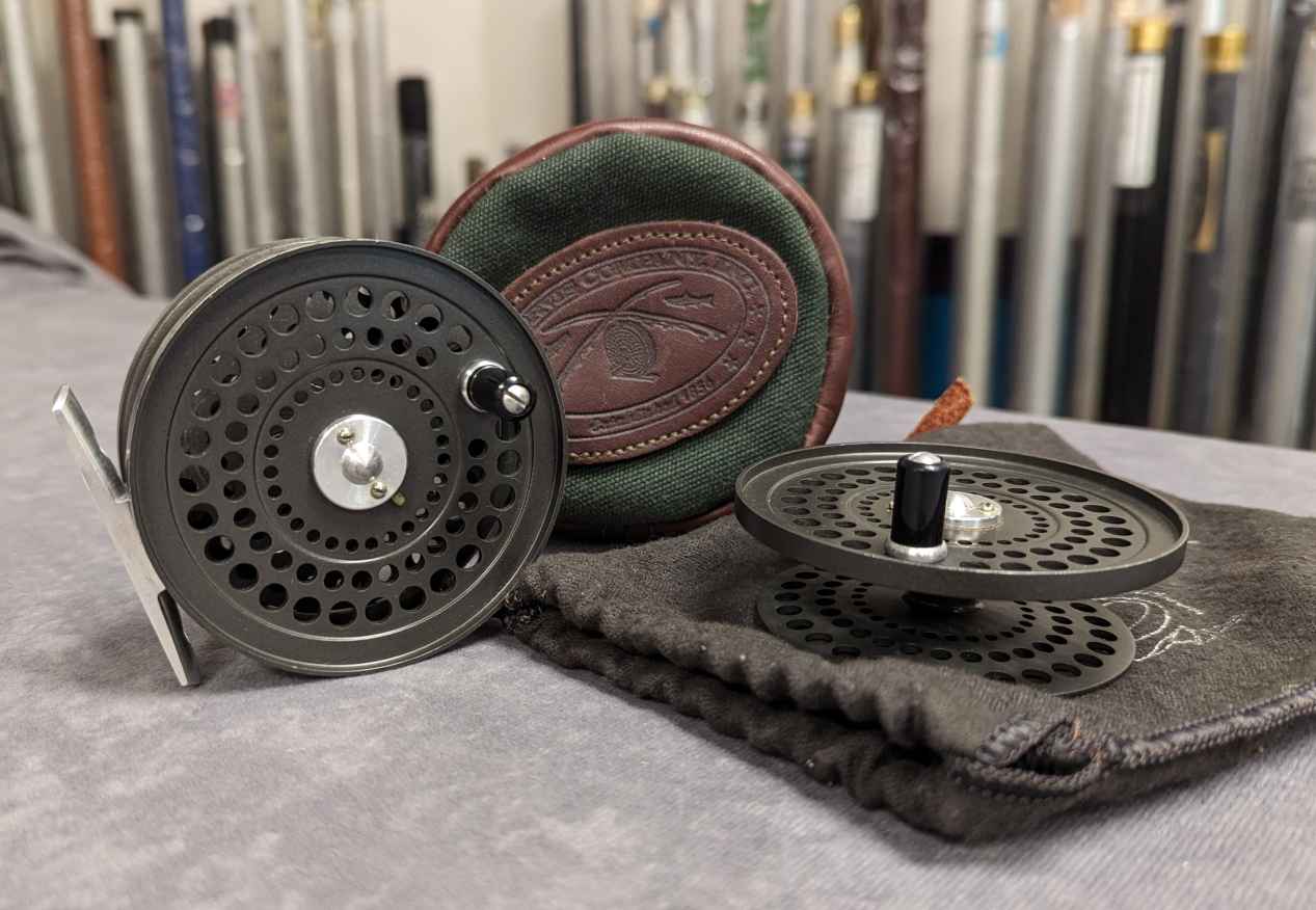 Reel comes stored in brown and green leather codura zippered reel