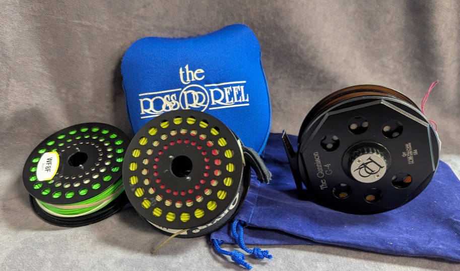 spool has Scientific Anglers AMP WF8F Sink tip fly line, other has WF8F Big Fly line. Reel, line and spools