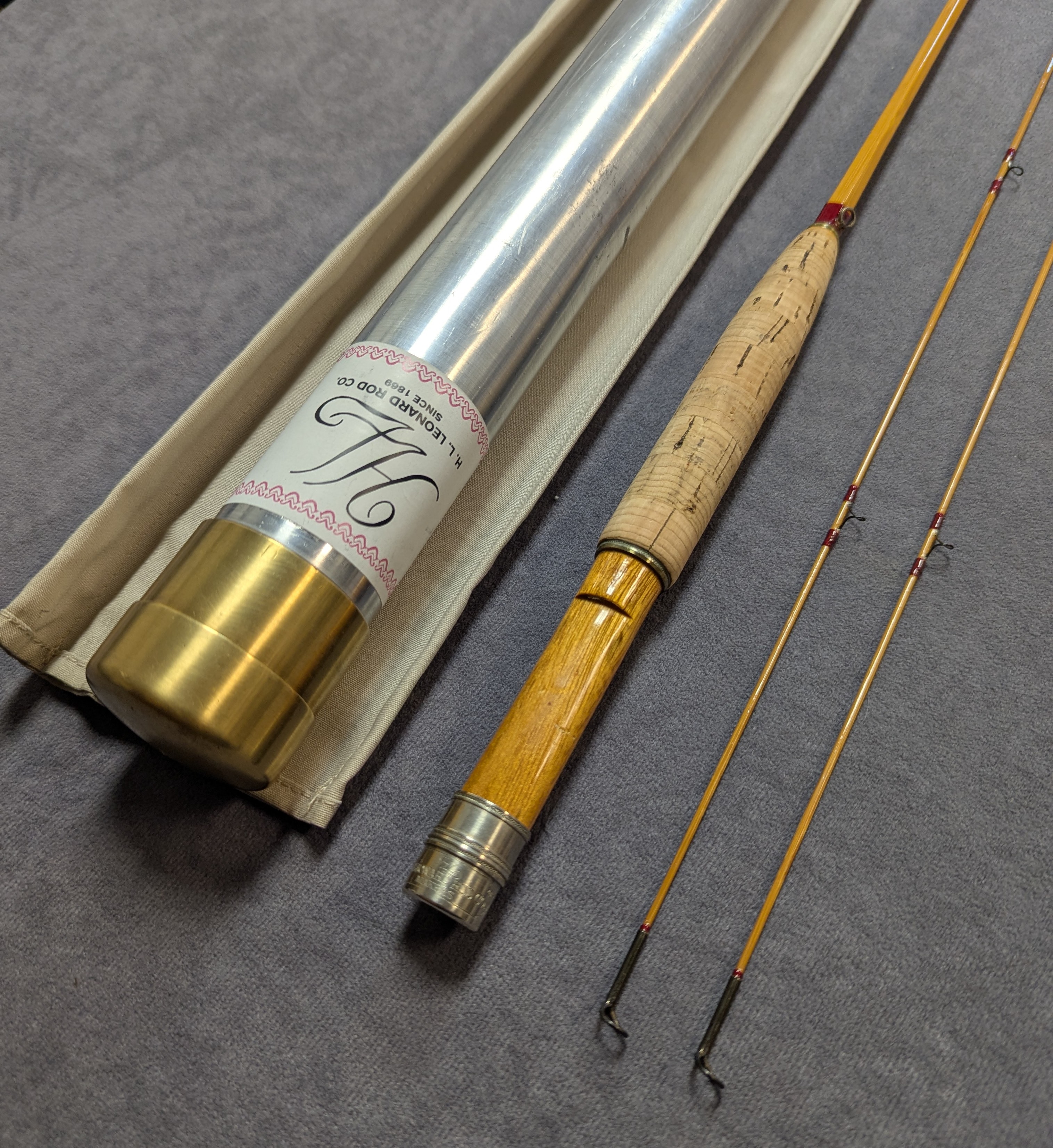 green cloth rod bag with hang tag and stored in original aluminum brass capped factory rod tube.