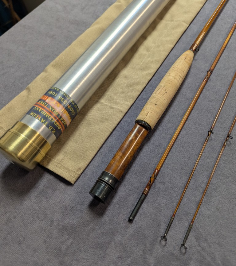stamped, "R.D. Taylor - Maker" with Walnut wooden reel seat. Rod comes khaki cloth rod bag and stored in aluminum