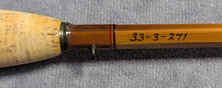 A superb small stream dry fly rod! Serial #33-3271. Very nice dark flamed cane. Blued nickel silver rod ferrules.
