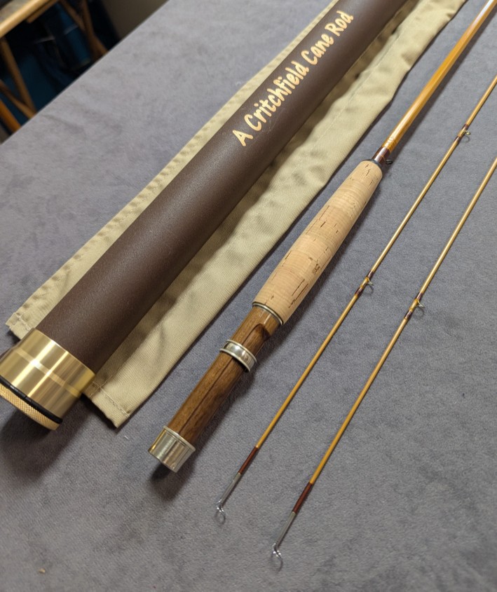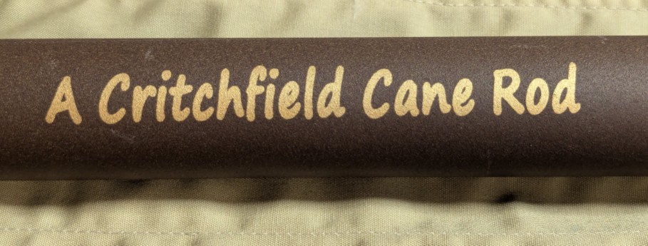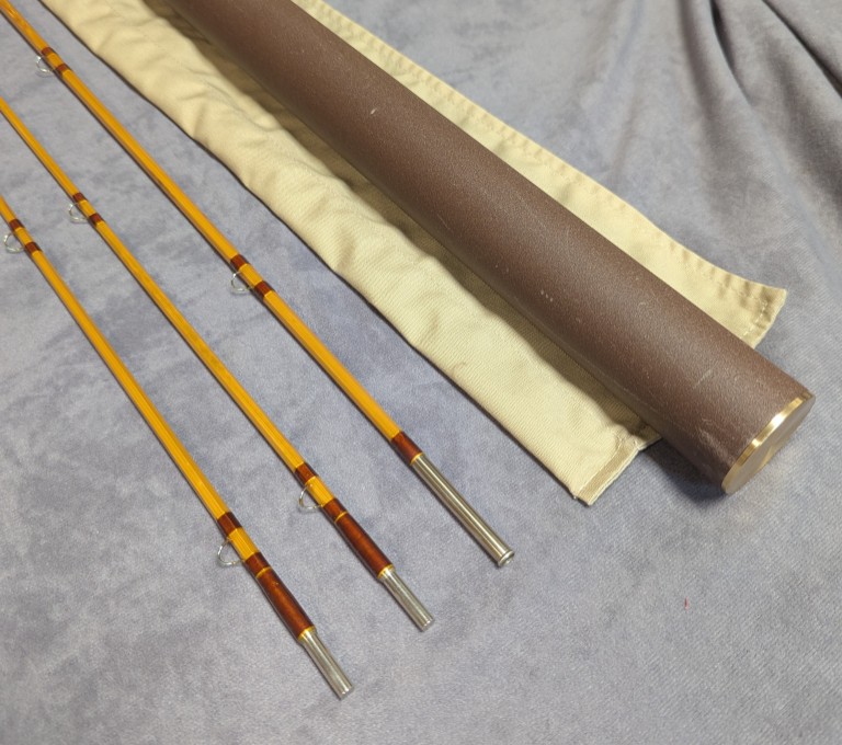 Rod is packed in khaki cloth rod bag and stored in brown labeled aluminum rod tube.