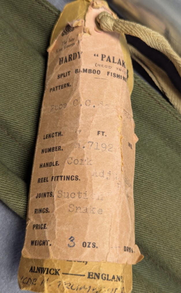 olive green factory Hardy labeled rod bag with hang tags and stored in aluminum