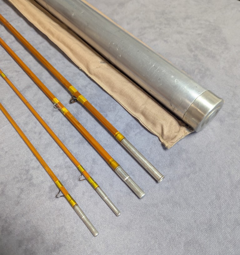 plastic reel seat spacer. Rod comes packed in brown cloth rod bag and stored in original aluminum labeled rod tube.