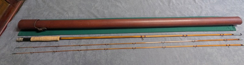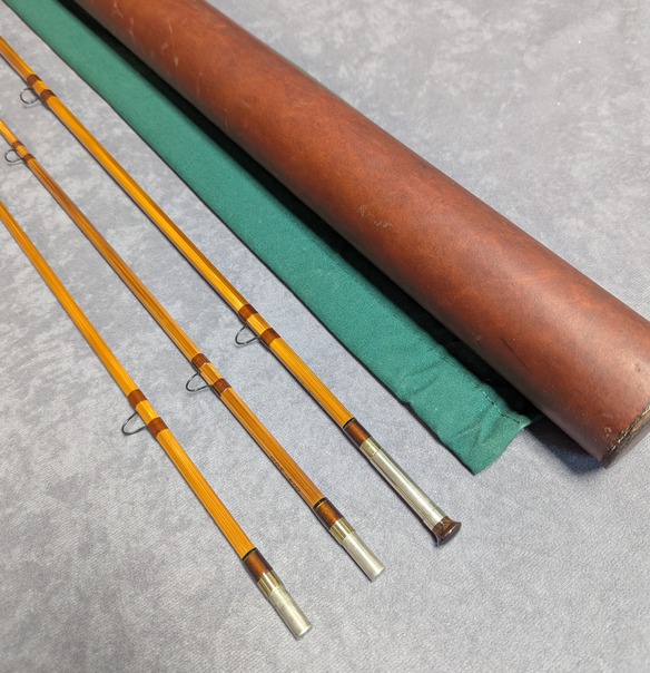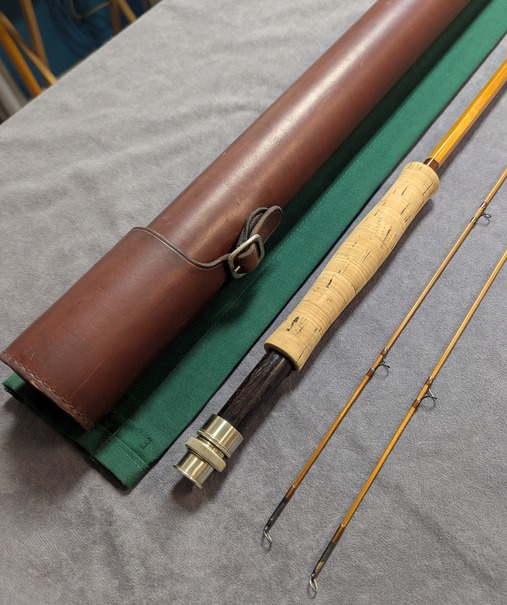 green cloth rod bag and stored in custom brown hard leather rod tube.