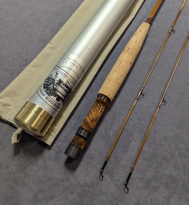 wooden reel seat. Rod comes packed in khaki cloth rod bag and stored in aluminum labeled brass capped rod tube.