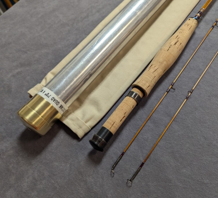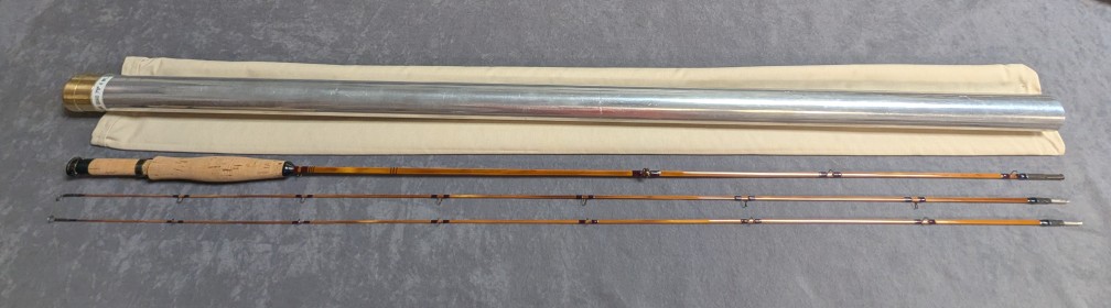 Medium fast dry fly action. Dark flamed tempered cane. Blued nickel