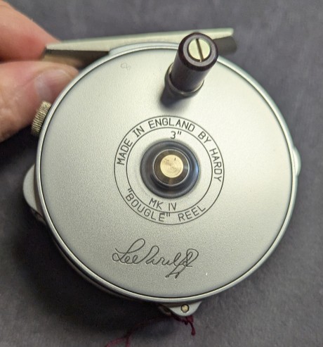 reel finish. Walnut wooden handle knob. Click and pawldrag system with rim regulator button. Set for RHW,