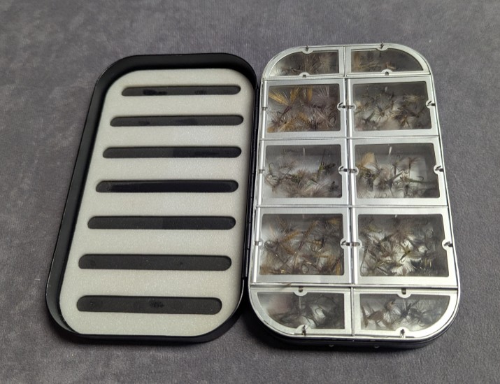 10 windowed compartments filled with dry flies in excellent condition. over 10 doz. flies.