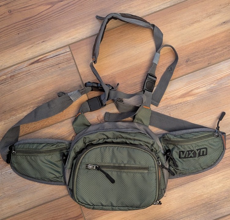 with padded neck strap. 7" x 4 1/2" pockets on either side. Olive green and gray.