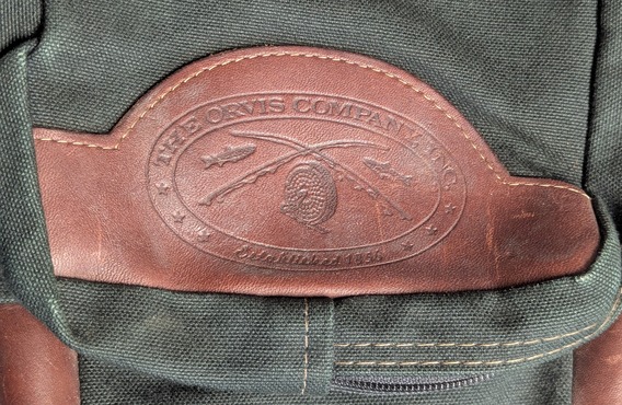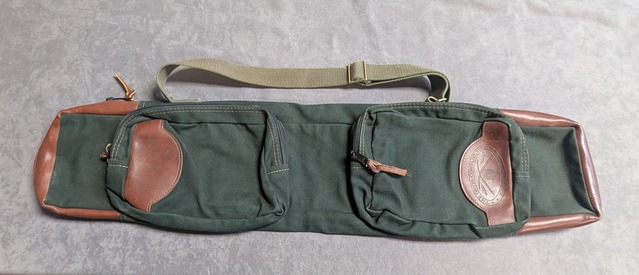 Measures 30" x 5 1/2" wide with 2 zippered pockets 9" x 6". to carry reels and fly boxes. Brown leather trim with heavy green canvas. Adjustable carry strap. $100.