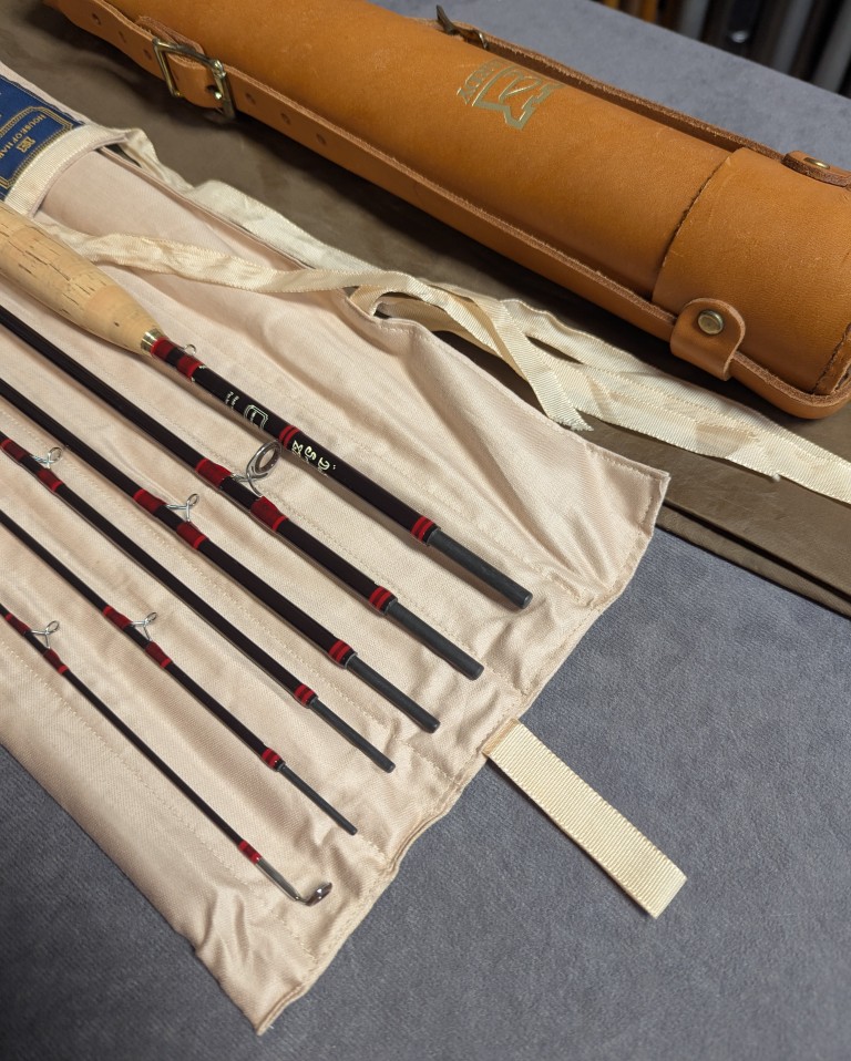 and stored in brown leather factory rod case. Rod is in new, unused condition.