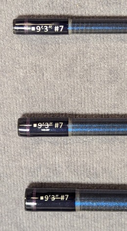 Wrapped in dark navy blue, ceramic stripper guides. Full Wells cork grip with blue