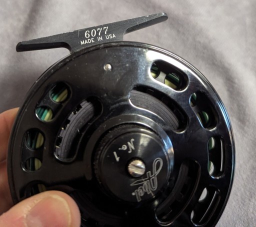 Takes 6-7 wt. lines. Serial #6077. Flat black anodized