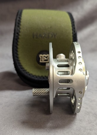 Reel is packed in Hardy marked green neoprene reel pouch.