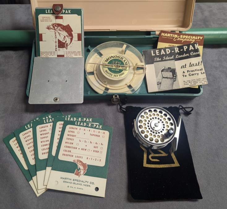 Has original "LEAD-R-PAK". a leader storage case. Attached to the case is the original Banty rod carry tube.