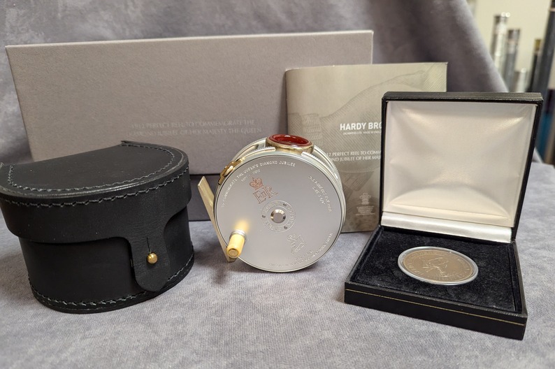 stamped factory reel case. Also included in this Commemorative reel set is a brass medallion in black leather box.