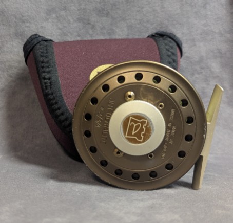 Reel comes packed in burgundy neoprene reel pouch.