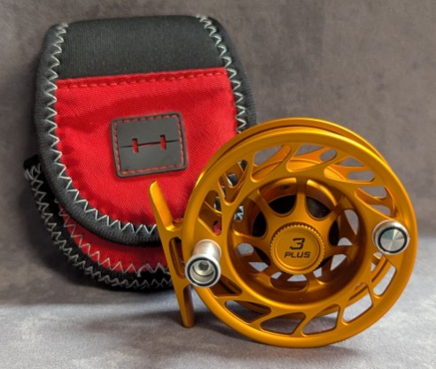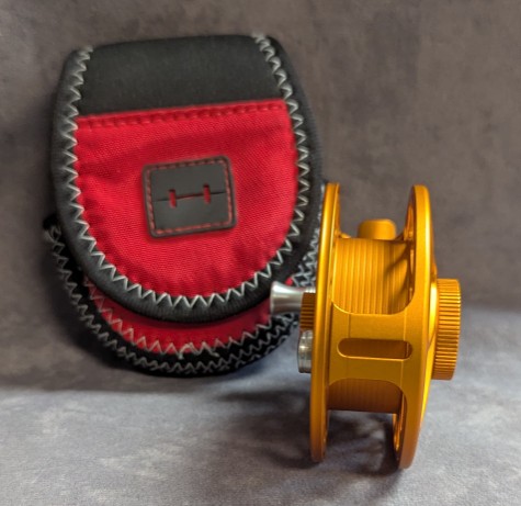 red and black factory neoprene reel pouch. Reel is in new, unused condition. $595.