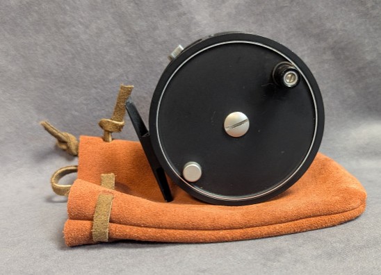 packed in leather drawstring reel bag. Reel and line are in very good condition.