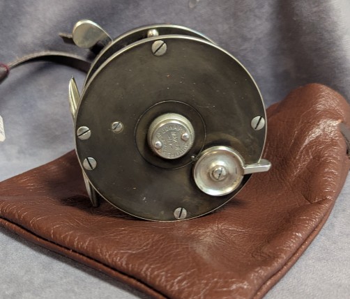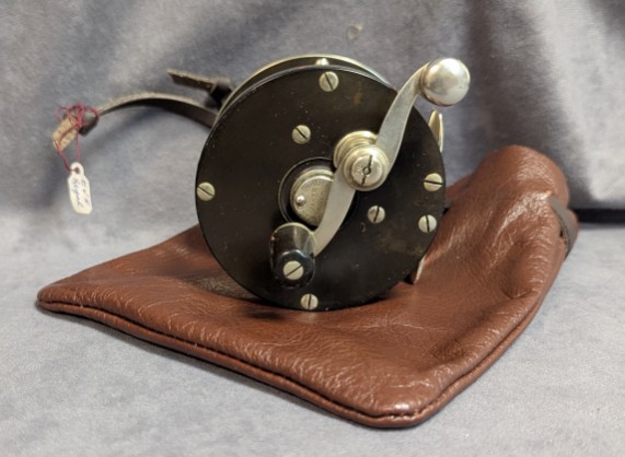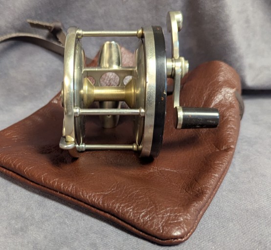 Reel comes stored in brown leather drawstring reel bag and is in very good condition. $395.