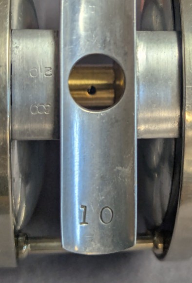 1 3/8" wide spool.Stamped on foot, "D189". Stamped on bottom of foot, "10". Takes 8-10 wt. lines.