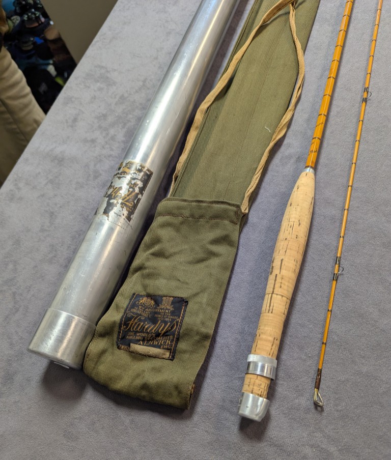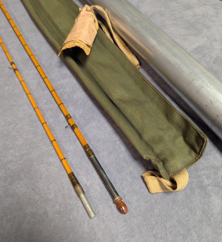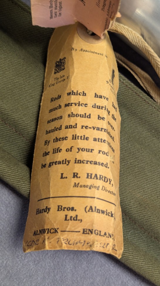 olive green factory Hardy labeled rod bag with hang tags and stored in aluminum