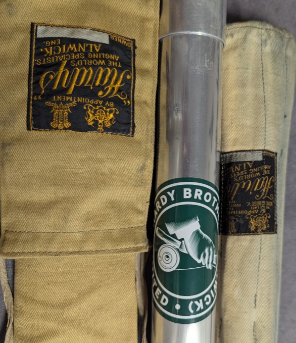 and stored in aluminum factory rod tube with outer protective Hardy labeled rod tube cover.