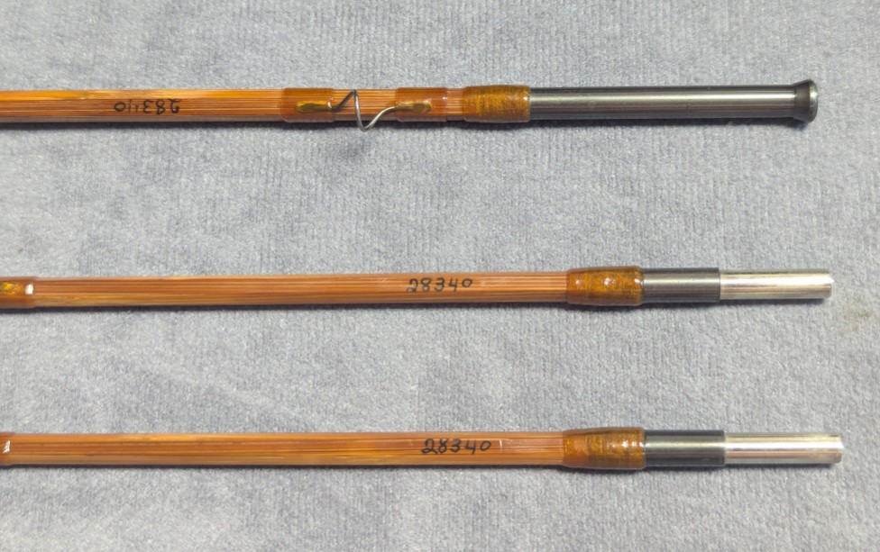 Serial #28340. Built in 1960. 2.2 oz. Very nice dark impregnated bamboo. Blued nickel silver rod ferrules.