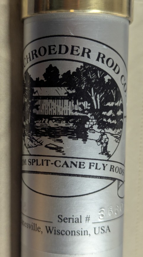 wooden reel seat. Rod comes packed in khaki cloth rod bag and stored in aluminum labeled brass capped rod tube.