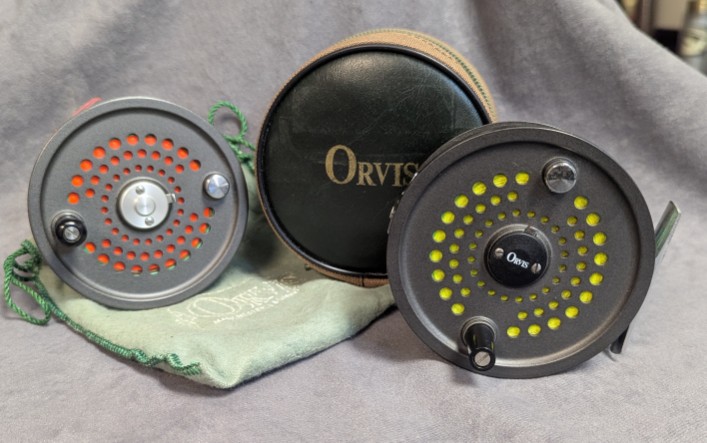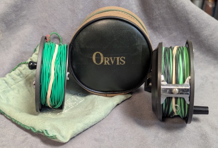 set for LHW, can be set to RHW. Reel comes stored in brown Orvis zippered reel case. Spool is stored in
