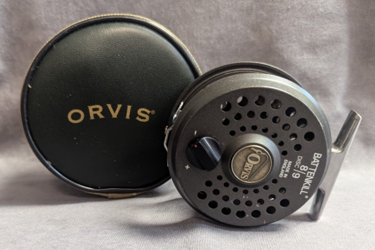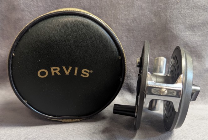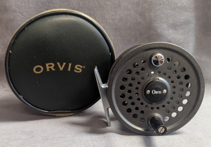 Reel comes packed in tan and green Orvis zippered reel case.