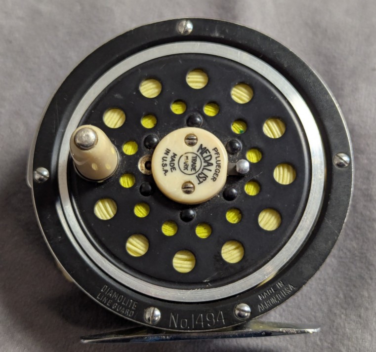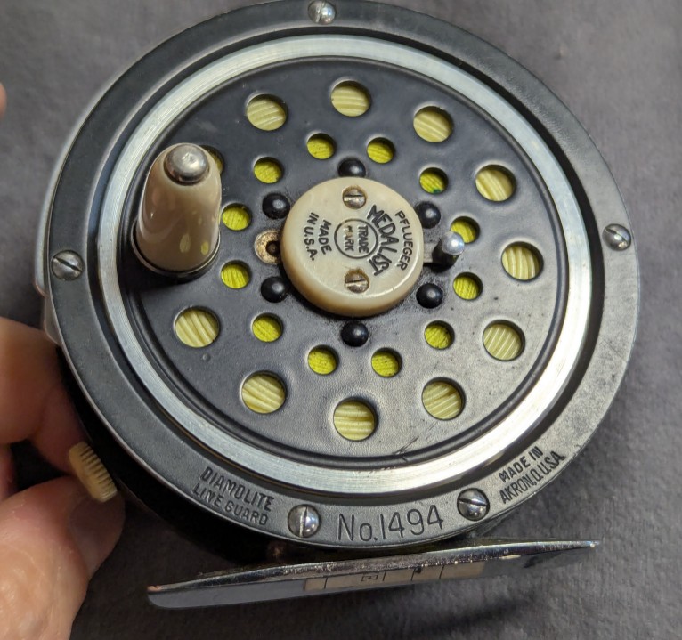 13/16" wide spool. Takes 5-7 wt. lines. Marked, "Made in Akron, OH" Black reel finish.