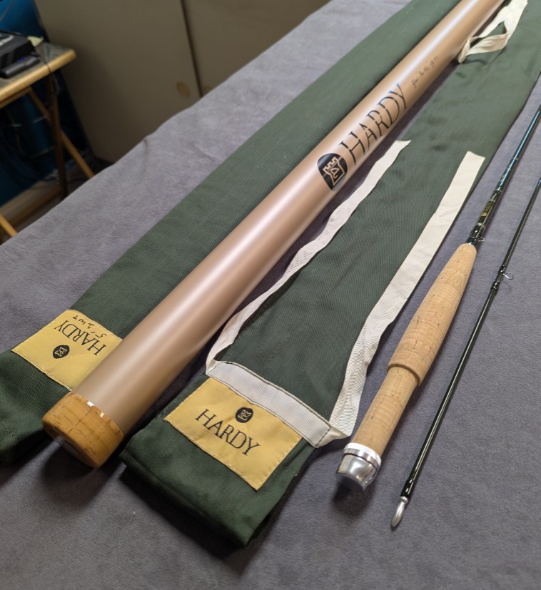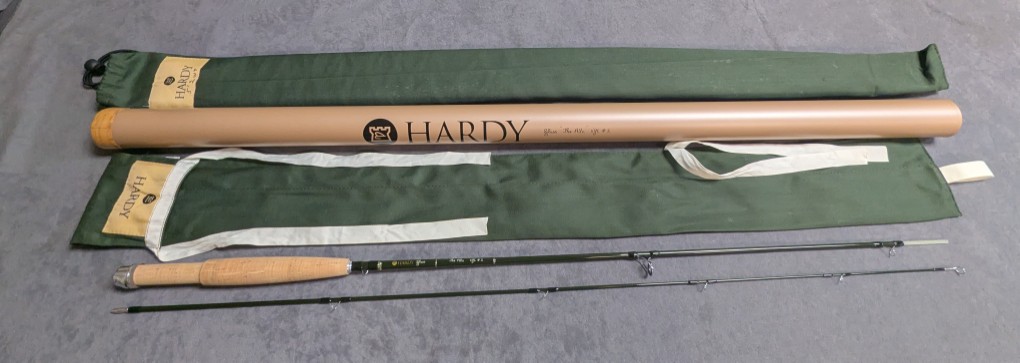 and packed in aluminum Hardy marked factory rod tube with green outer bag tube cover.