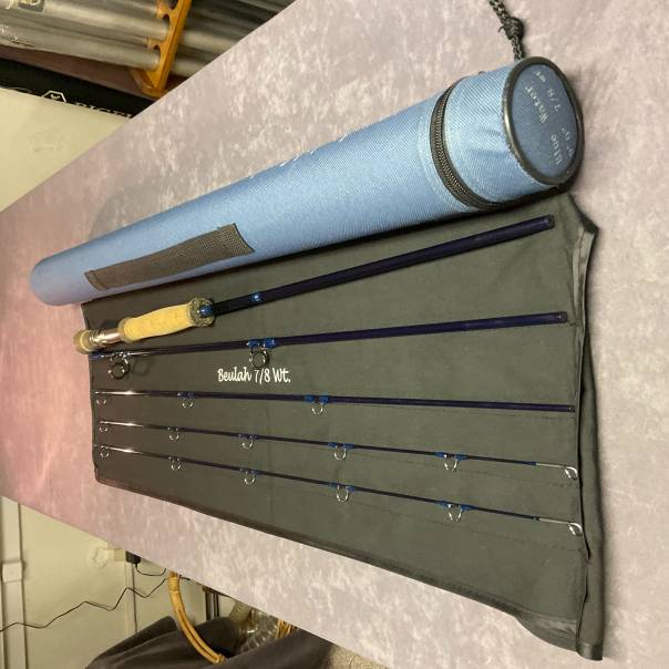 Rod comes stored in black factory cloth rod bag and packed in blue labeled factory codura rod tube.
