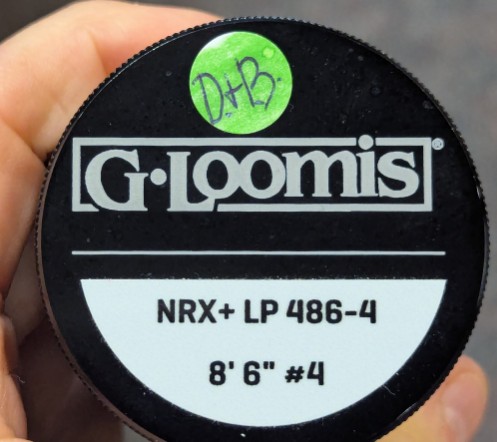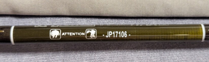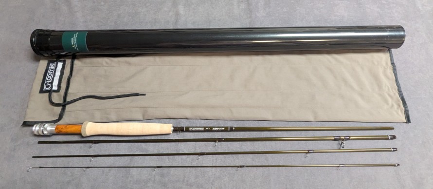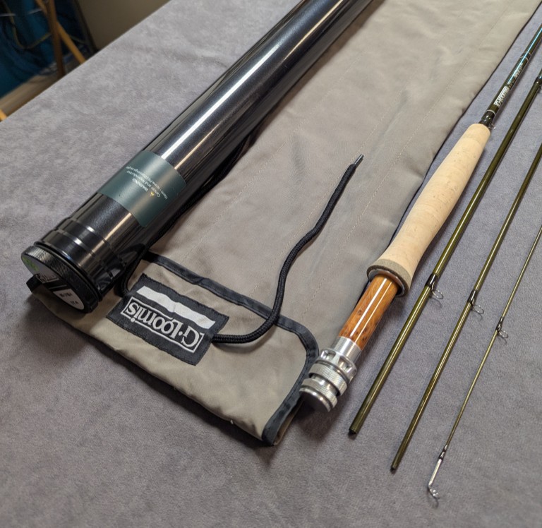 Serial #JP17106. Wrapped in dark green threads, ceramic stripper guide. Western styled cork grip with up-locking bright anodized aluminum reel seat with burled wooden reel seat spacer. Rod comes packed in green Loomis labeled factory rod bag and stored in black aluminum labeled factory rod tube. Rod is in new, unused condition. $550.