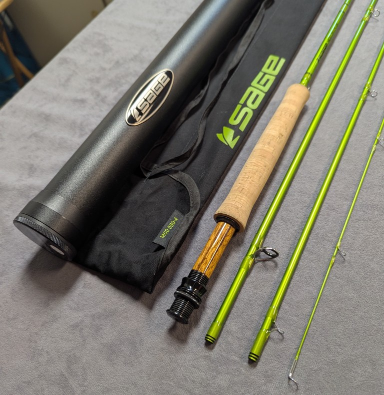 Wrapped in bright green threads, ceramic stripper guide. Full Wells cork grip with black anodized aluminum