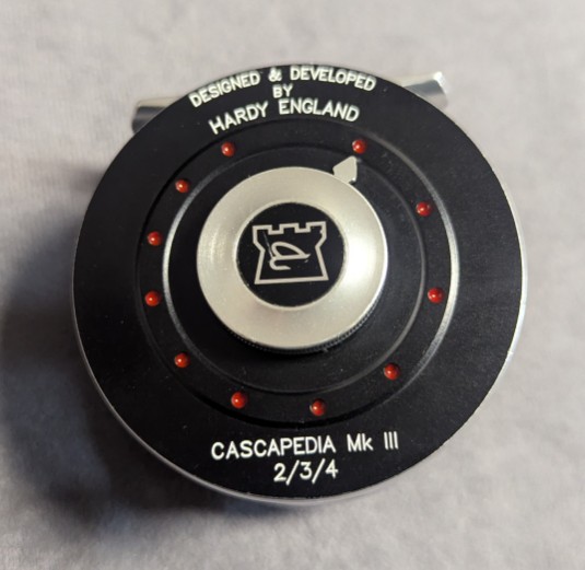 Serial #E00527. Black and silver anodized reel finish.