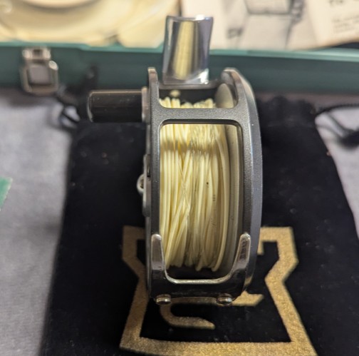 and backing. Reel comes stored in original green and white plastic tackle chest with empty fly line container.