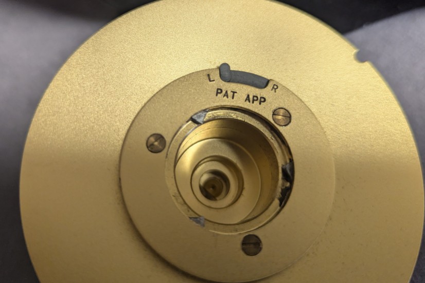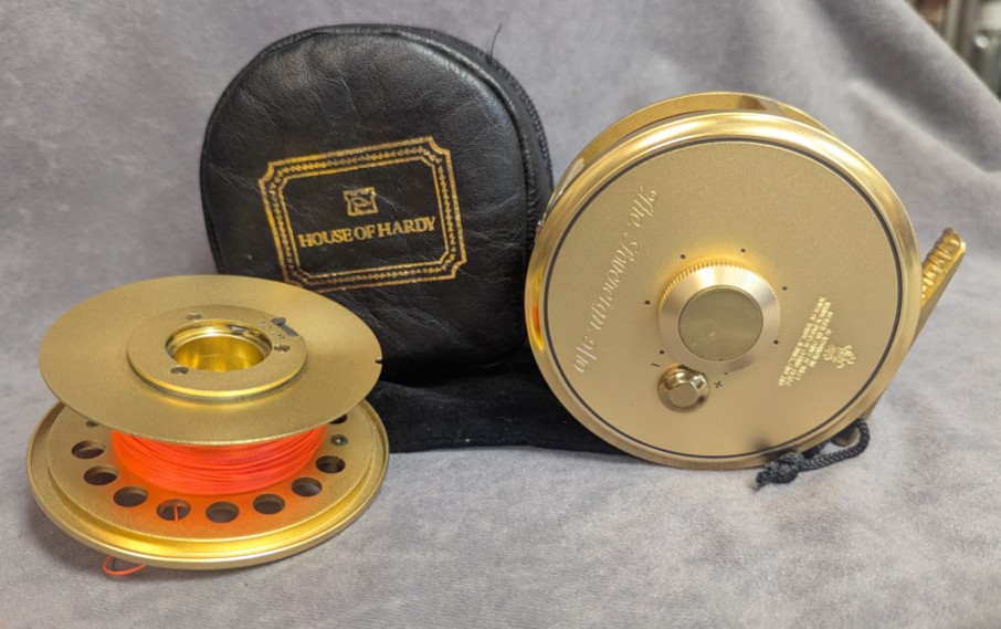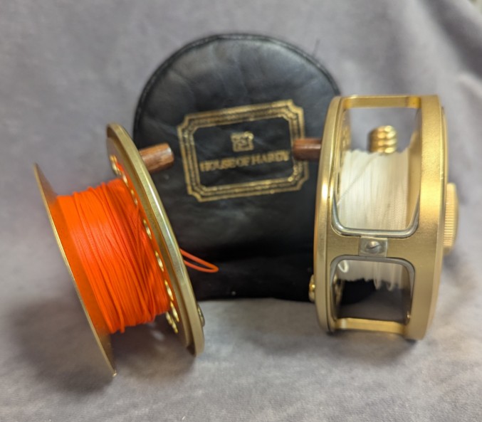 Ribbed brass reel foot. Reel comes with extra spool. Spool has Teeny Streamer WF400S